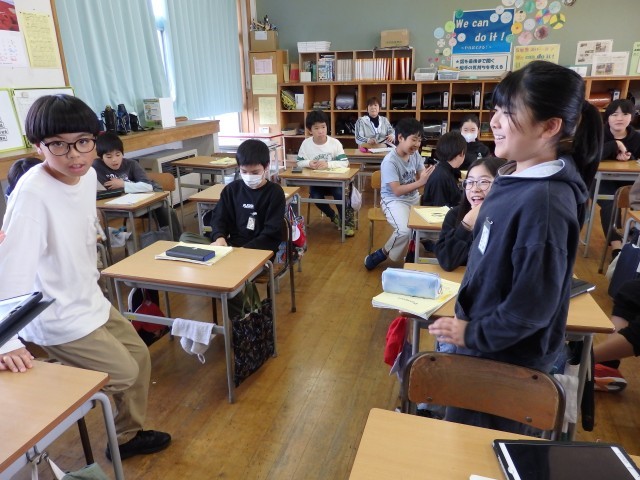 5年生の3時間目は国際科の授業でした。まずはペアで今日の気分や天気、日付などを質問し合いました。その後、「~へ行きたい」という表現を使って、自分が行きたい都道府県を伝え合う学習をしました。行きたい県とその理由について教科書の4人の登場人物によるスピーチを聞き取り、「行きたい」はどういう英語なのかを確かめました。前に学習した「~になりたい」と同じ表現だと気付いた子がいました。すごい!最後にクラスの他の子たちがどの都道府県に行きたいのかインタビューしました。