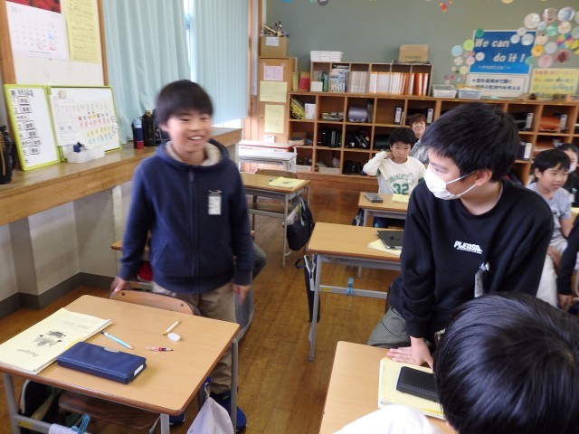 5年生の3時間目は算数の授業でした。分数の学習です。教科書にある単元のまとめの問題「できるようになったこと」に取り組んでいました。問題を多く解いて計算力アップの時間です。終わった人は廊下に貼ってある答えを見て自分で丸付けをします。丸付けも終わったら「分からないから教えて!」と言う人にやり方を教えます。とてもいい雰囲気の中での学び合いでした。