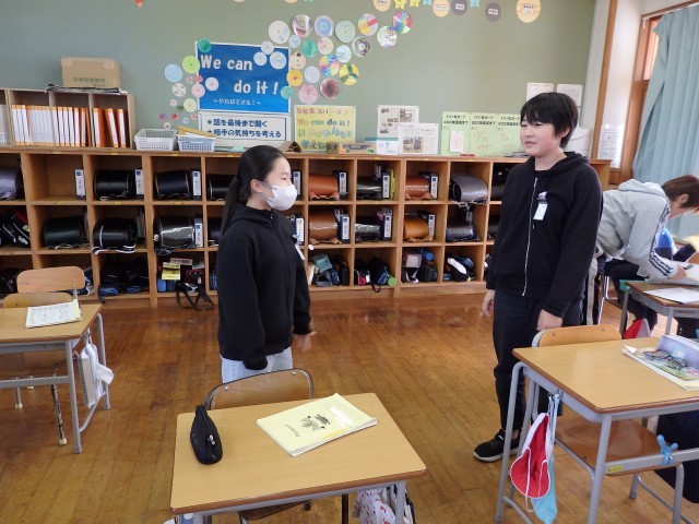 5年生の5時間目は総合の授業でした。学習発表会のシナリオが完成したので、それをもとにして配役を決めました。テーマは「田んぼと米づくり」です。配役が決まったら、同じ役割の人で集まって、誰がどのセリフを言うのかなどを決めました。本番までの練習を協力して取り組んで、5年生らしい発表をしてほしいです。