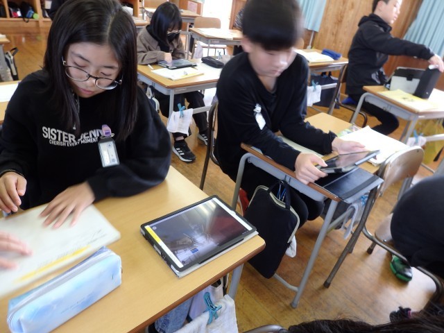 5年生の3時間目は国際科の授業でした。まずはALTの先生はランダムで選んだ2人ペアで、お互いの気分をたずね合いました。その後、自分が行きたい都道府県について理由も合わせてスピーチをするために、その県の魅力を調べたり、画像を保存したりしました。
