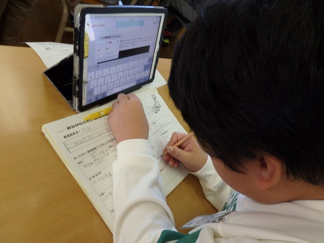 5年生の1時間目は国際科の授業でした。まずはALTの先生や友だちと今日の気分や天気、日付などのやり取りを行いました。続いて、前回の授業でやった「行きたい県インタビュー」について、1人ずつ「I want to go to ~.」で発表していきました。行きたい県ナンバー1は東京でした。その後、自分が行きたい県の魅力を探るためにインターネットで調べ学習を行いました。最後の写真が見えますでしょうか。「何ができるのか」「そこでしたいこと」など具体的に調べた結果を書いている子がいました。