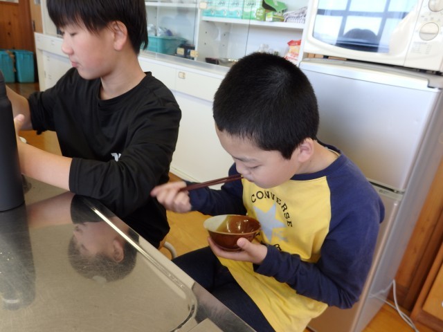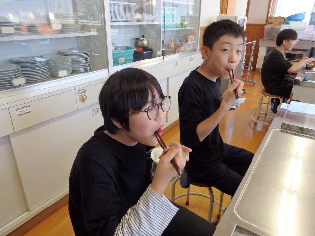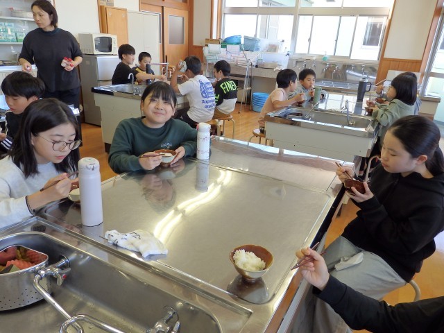 5年生の調理実習。味噌汁が完成したので、みんなで「いただきます!」野菜もよく火が通っていて、塩加減もちょうどいい感じでおいしかったです。4人で鍋一杯を完食した班がいくつもありました。中には5杯も食べた子がいました。