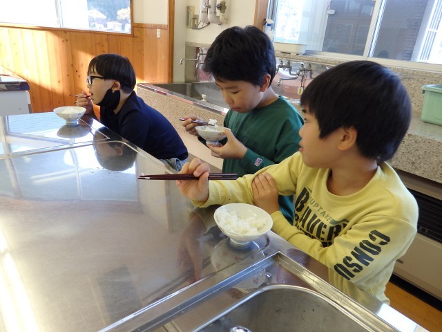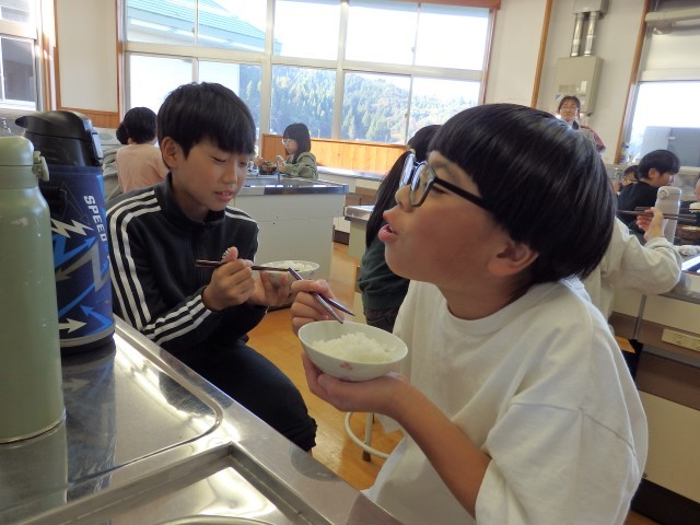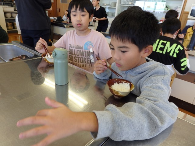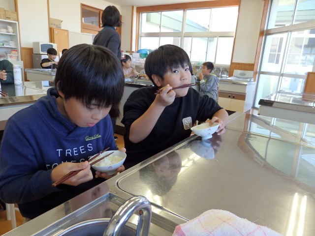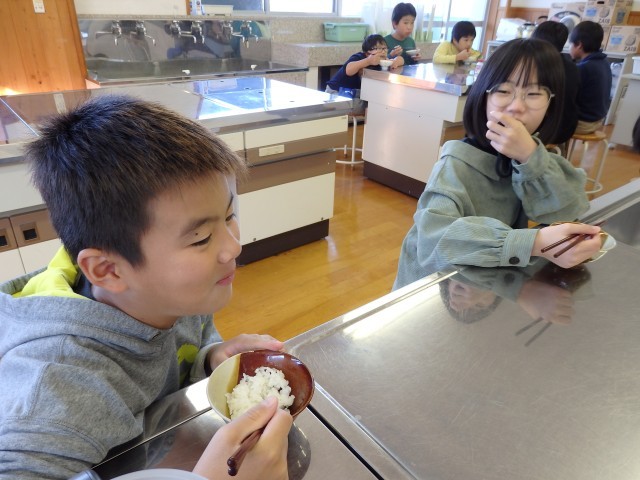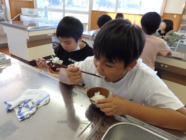 5年生の5時間目です。自分たちで育て収穫したお米「げき・う米」の試食です。さすが新米、香りや味が違いますね。