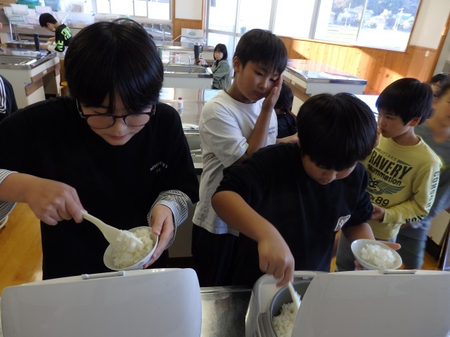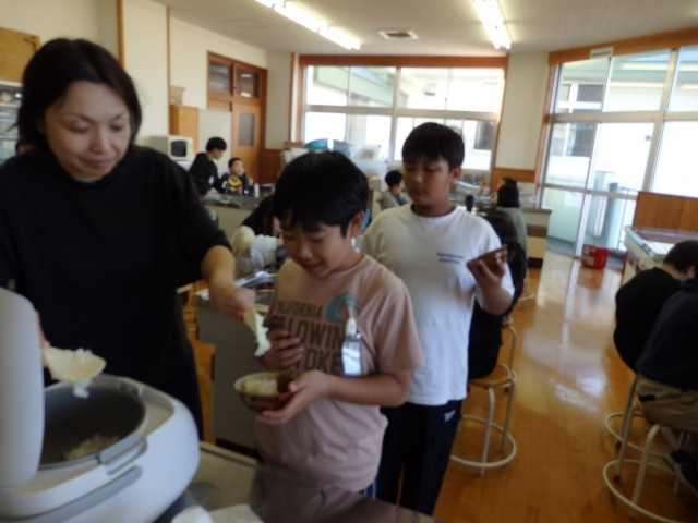見事な食べっぷりの5年生です。男子も女子も次々にお替わりに並び、炊飯ジャー2つで合計16合炊いたご飯がものの数分で完食!元気な証拠ですね。