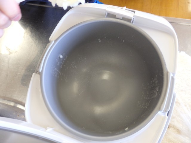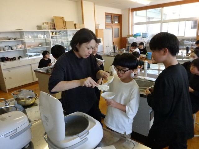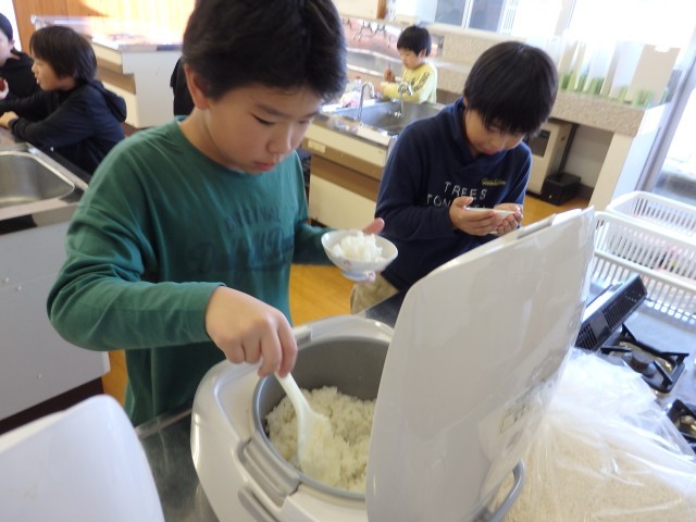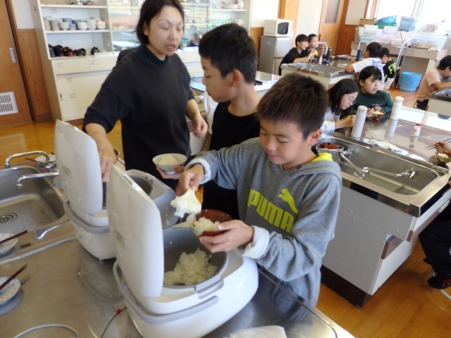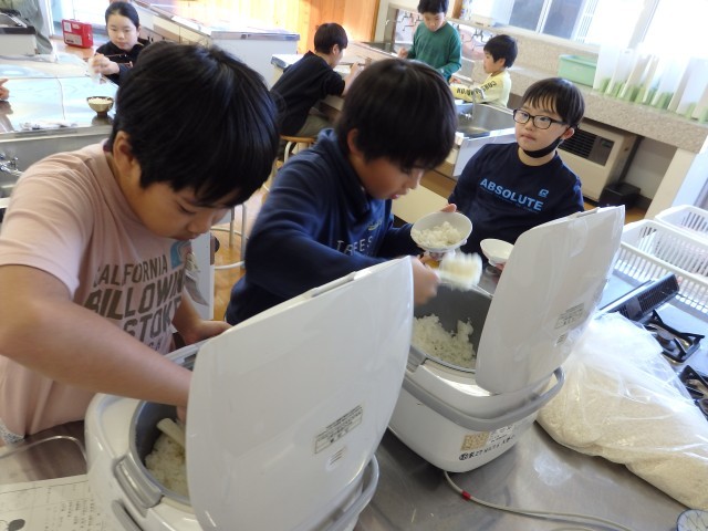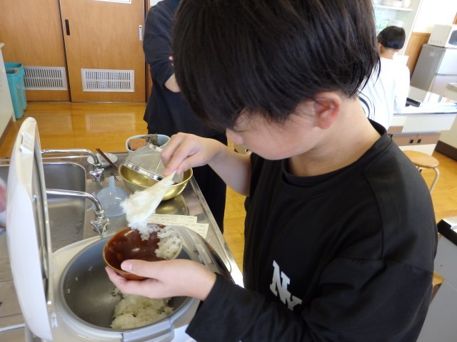 5年生の調理実習、ご飯が炊き上がりました。さすが新米です。いい香りが1階の廊下にまで漂ってきました。班ごとに協力して、ご飯をかき混ぜる人、洗い物をする人、食器を準備する人と別れて準備をして「いただきます!」 私もお裾分けしていただきましたが、おいしく炊けていました。炊いたご飯は見事に完食です。