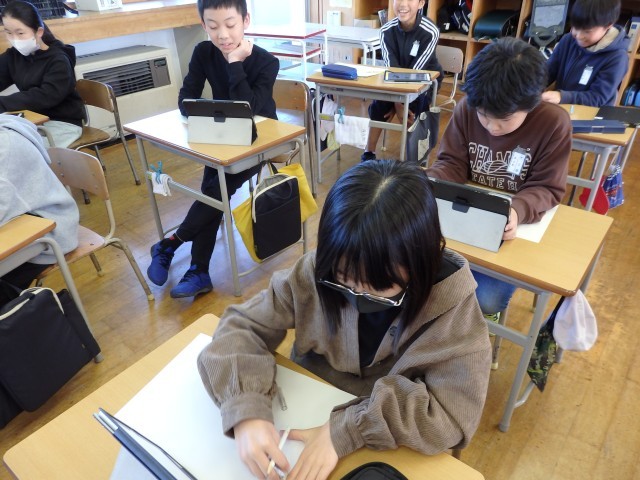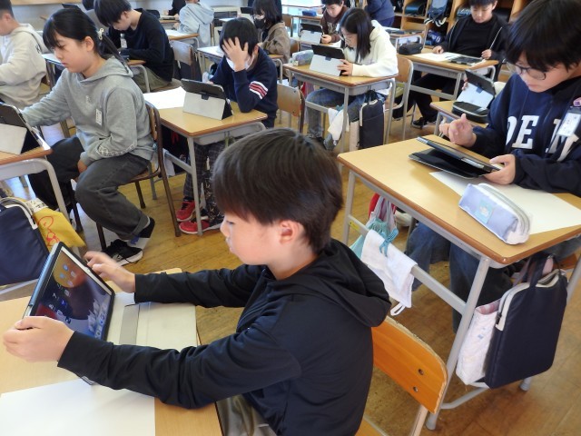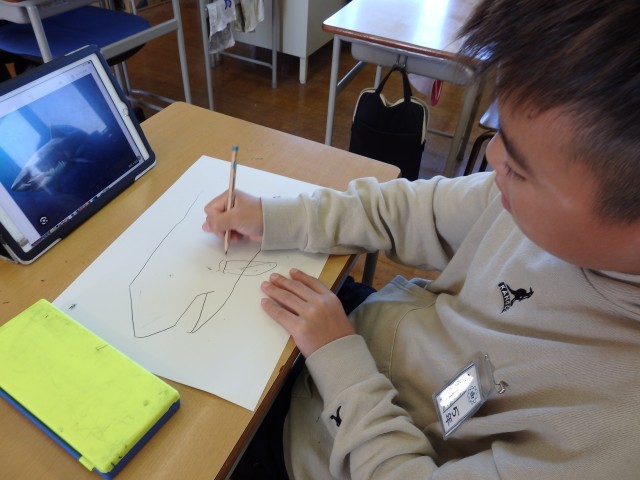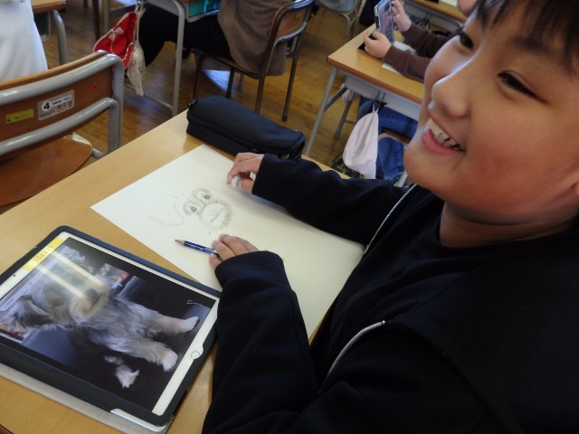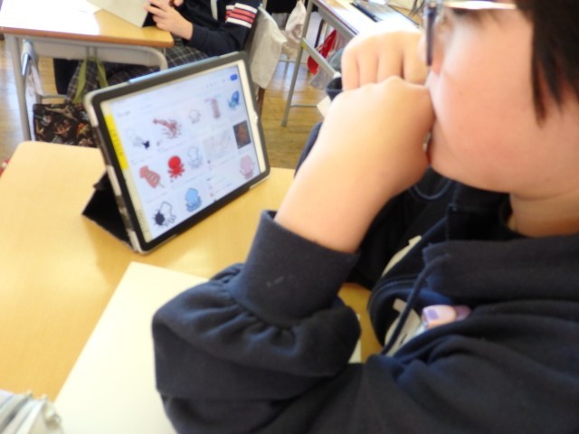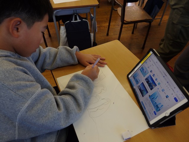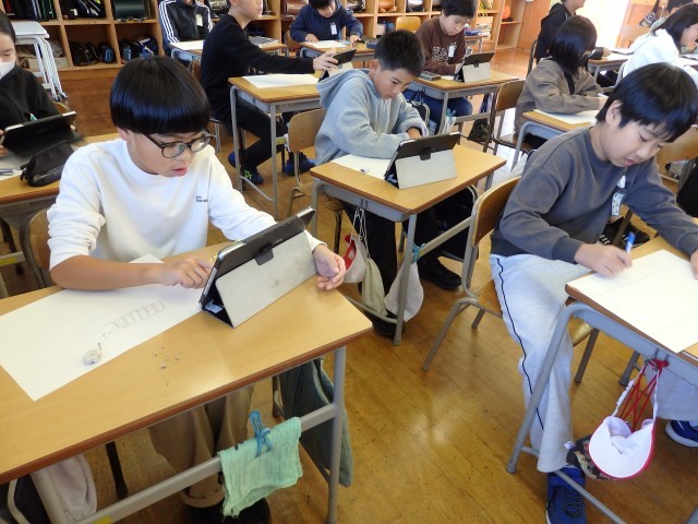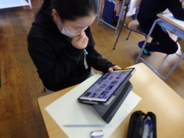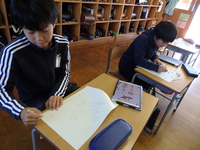 5年生の4時間目は図工の授業でした。多色木版画の学習です。今日と次の時間の2時間で下書きをします。まずは何を描くのかを決め、インターネットで画像を検索したり、家で撮ってきた写真をもとにして下書きを始めました。イカ、カエル、カブトムシ(しかも家で飼っているヘラクレスオオカブト!)、ペットの犬やネコ、イモリ、宇宙船などを描いていました。