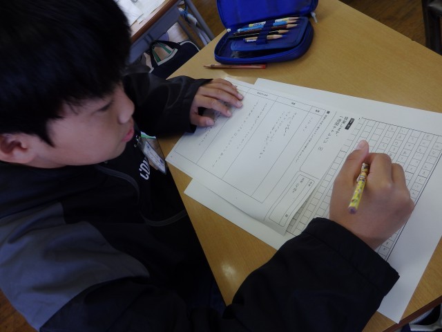 5年生の1時間目は国語の授業でした。「提案します、1週間チャレンジ」の学習です。「こんなことをしてみない?」と学級で取り組みたいことの提案を書きました。前の授業で書いた「内容」「考えたきっかけ・理由」「その効果」の構想メモをもとにして提案文を書きます。「忘れ物ゼロ週間」「廊下を歩こう週間」「落ち着いて行動週間」「給食残しゼロ週間」「1週間仲良くチャレンジ」「1週間姿勢よくチャレンジ」などの提案文が書かれていました。中には「全校オニごっこ」を提案する子もいました。