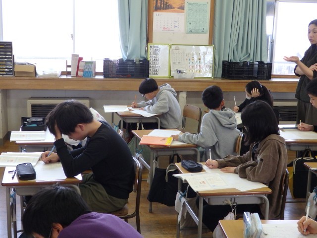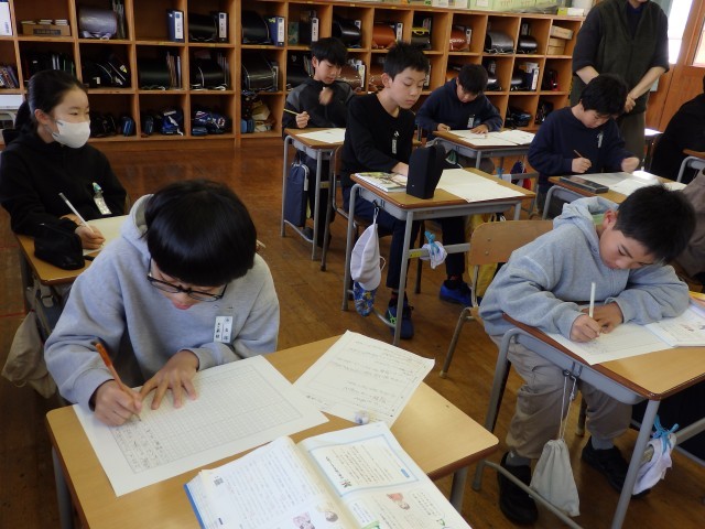 5年生の4時間目は国語の授業でした。「和の文化を受け継ぐ」の学習です。教科書の中で出てきた「根付く」「風情」「感性」などの意味が分からないことばの意味を調べていました。読み方や「ず」なのか「づ」なのかなどを確かめてから、国語辞典を使って自分で調べていきました。語彙を広げるということは、今、南魚沼市全小中学校で取り組んでいる「読む力」の育成には大切なことです。
