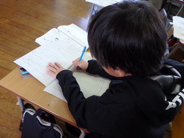 5年生の3時間目は算数の授業でした。分数の学習です。教科書にある単元のまとめの問題「できるようになったこと」に取り組んでいました。問題を多く解いて計算力アップの時間です。終わった人は廊下に貼ってある答えを見て自分で丸付けをします。丸付けも終わったら「分からないから教えて!」と言う人にやり方を教えます。とてもいい雰囲気の中での学び合いでした。