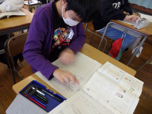 5年生の4時間目は図工の授業でした。多色木版画の学習です。今日と次の時間の2時間で下書きをします。まずは何を描くのかを決め、インターネットで画像を検索したり、家で撮ってきた写真をもとにして下書きを始めました。イカ、カエル、カブトムシ(しかも家で飼っているヘラクレスオオカブト!)、ペットの犬やネコ、イモリ、宇宙船などを描いていました。