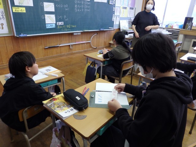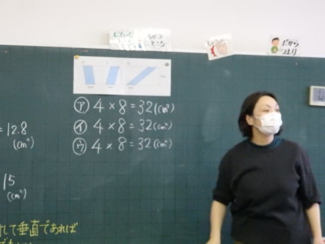 5年生の3時間目は算数の授業でした。図形の学習です。昨日に引き続き、平行四辺形の面積について学習しました。まずは3つの平行四辺形が示されました。底辺も高さも一緒ですが、傾きが違います。傾きが大きい方が面積が少なく見えますが、公式に当てはめると3つ全部面積は同じということが分かりました。その後、今度は同じ3つの平行四辺形でも面積と高さの数値は書かれていますが底辺の長さが分かりません。どうやって底辺の長さを求めたらいいのか考えました。