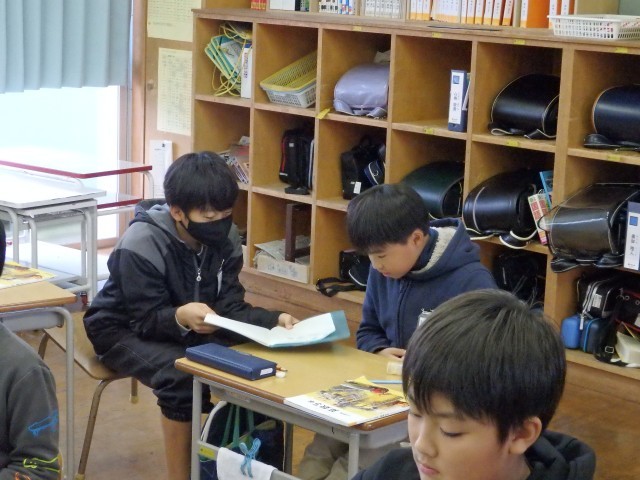 5年生の2時間目は総合の授業でした。学習発表会での発表練習をしていました。ステージでの発表を見越して、音楽室で練習しました。まずは同じ役割の人で集まってセリフの確認をした後、本番どおりの流れで練習しました。もうすっかり自分のセリフを覚えている子が何人もいました。