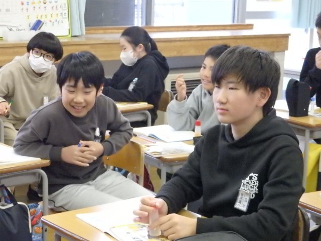 5年生の2時間目です。最初に「お楽しみ会で何をするか」を話し合っていました。学級委員の子が司会を務め、子どもたち主導での話し合いです。バスケ、バドミントン、オニごっこ、キツネ狩りと意見が出され多数決で2つに決めました。選ばれた2つはオニごっことキツネ狩り。過酷なお楽しみ会になりそうです。