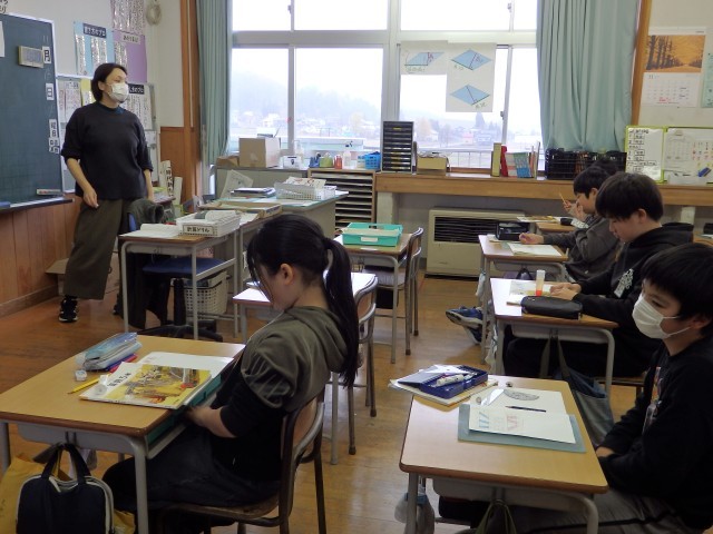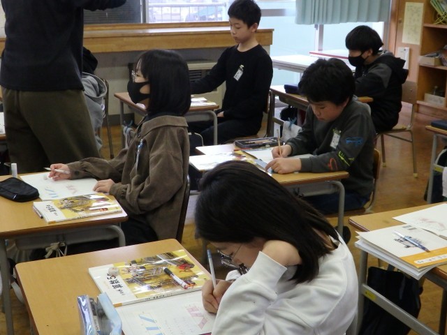 5年生の4時間目は図工の授業でした。木版画の下書きです。宇宙、海、ススキと月、カエル、カブトムシ、サメ、花、イカ、ツリーハウス、飼っているペットなどいろいろな物が描かれていました。みんな、とても上手です。下書きが終わった子から板に転写していきました。