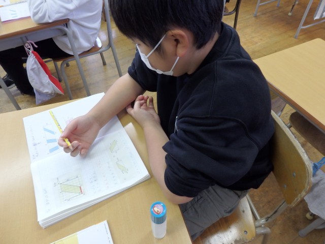 5年生の4時間目は国語の授業でした。前半は前の時間に行った漢字テストが返されました。「ほら見て!」とうれしそうに点数を見せてくれる人が何人かいました。間違えたところを直したら、先生に再度見てもらいました。後半は「和の文化を受け継ぐ」という評論文の学習です。本論での「和菓子はどのようにして今の形を確立していったのか」を読み取っていきました。何度も何度も読み返し、どこに書かれているのかを考えました。
