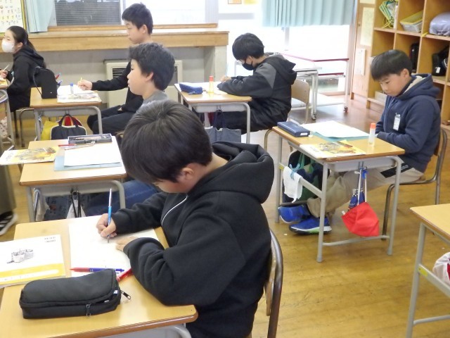 5年生の1時間目は道徳の授業でした。まずは「いじめゼロにするために大切なこと」について班ごとで話し合いました。話し合った結果を学級委員の子が代表委員会やいじめ見逃しゼロスクール集会で発表します。続いては「家族のことをよく知ろう」ということで「家族ビンゴ」を行いました。「小学校の時の好きな教科・嫌いな教科」、「宝物は何か」、「将来なりたい職業は何だったか」などの9個の質問の答えを予想して、縦3横3のマスに書き込みます。家に帰ったらお家の人の誰かに質問して答え合わせです。見事、ビンゴ達成なるでしょうか。