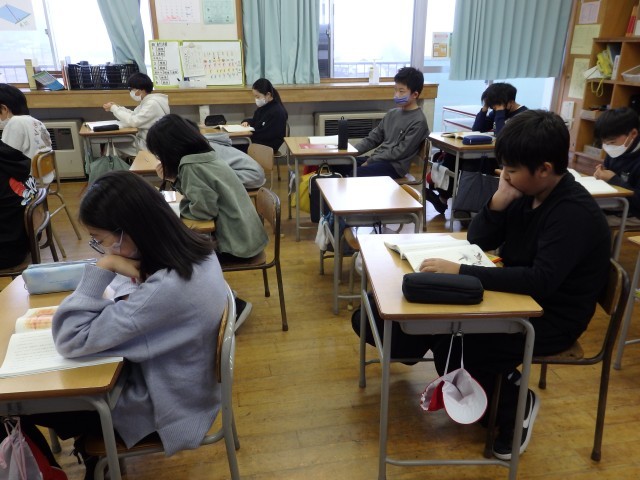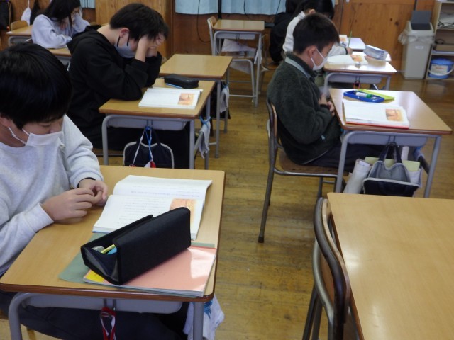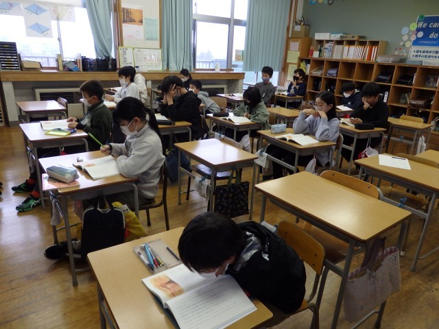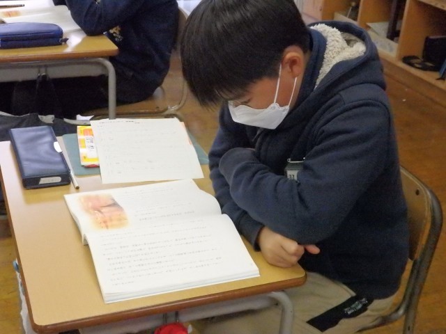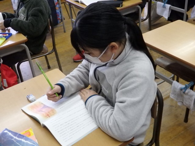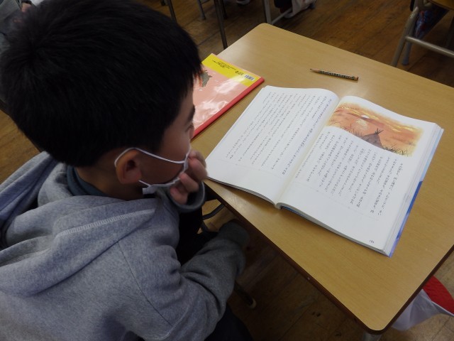 5年生の時間目は国語の授業でした。今日から「太造じいさんとがん」の学習です。まずは先生が物語を音読し、それを聞きながら黙読しました。物語の世界に集中しているのがよく分かりますね。鉛筆を持って、読み方が分からない漢字などに書き込みをしている子がいました。