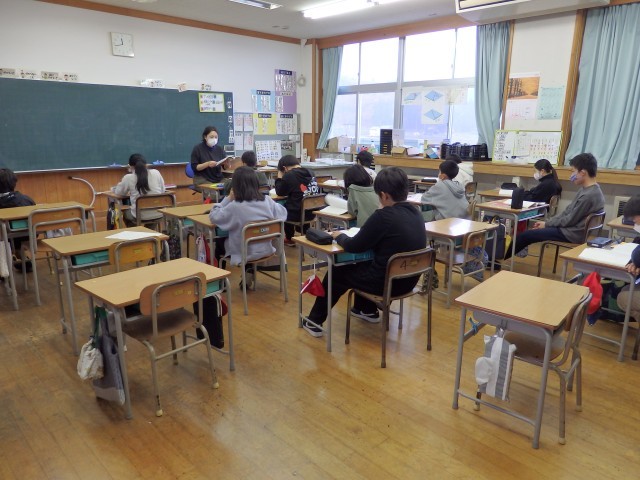 5年生の4時間目は算数の授業でした。4時間目も市学習指導センターの指導主事や他校の先生が参観しました。図形の学習で三角形の面積の求め方を考えました。まずは、近くの人と話し合いをしながら、黒板に貼られた三角形の図形を見て、「前と違うところ」「分かること」などの意見を出していきました。その中で「平行四辺形の面積の求め方に÷2をつけたらいいんじゃないか?」という考えが出されたところで、実際に三角形を切って移動させることで求め方を考えました。何度も試行錯誤している様子が分かりますね。