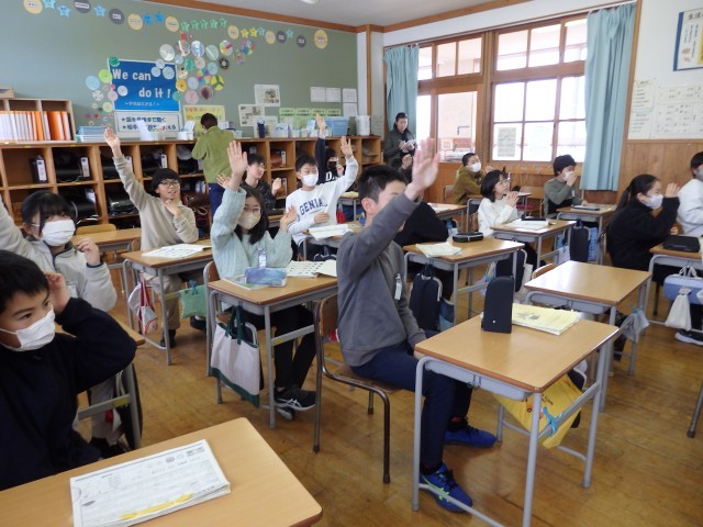 5年生、国際交流会が終わってみんなで記念撮影です。記念撮影後は笑顔でハイタッチをしてお別れです。
