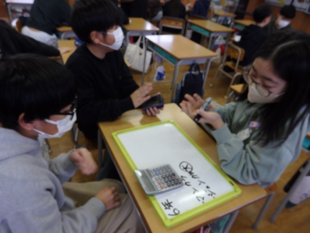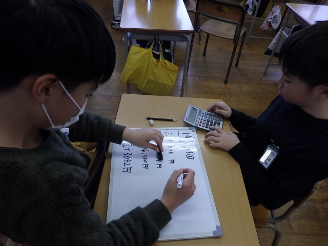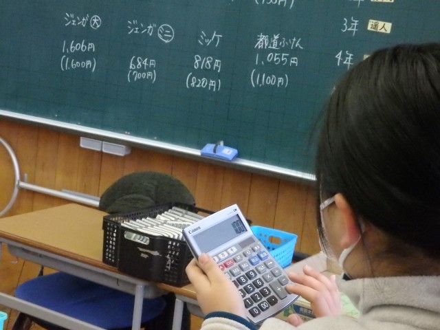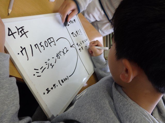 5年生の2時間目は学活の授業でした。「激・う米」の販売で得たお金で、各学年へプレゼントする冬の遊び道具をリストアップしていました。UNOやトランプ、ジェンガ、絵本の「ミッケ」など、担任の先生が黒板に書いたリストを見て、電卓で合計金額を計算しながら班ごとで考えました。各学年の予算は3,000円。サンタクロースになった5年生といったところですね。ありがとう!