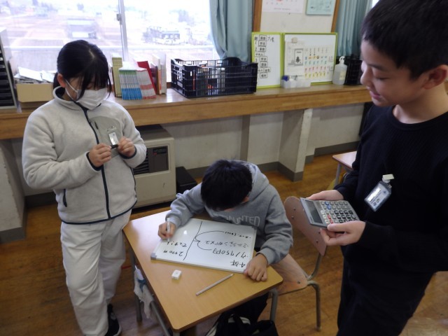 5年生の3時間目は算数の授業でした。図形の面積を求める問題に取り組んでいました。今日は教室と図工室の2チームに分かれ、それぞれの教室に1人ずつ先生が付いて問題に取り組みました。分からない問題のヒントをもらいながら集中して取り組んでいました。