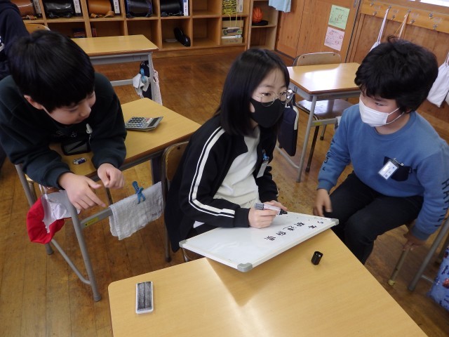 4年生の1時間目は国語の授業でした。「ごんぎつね」の学習です。この物語は、登場人物の1人である加助が語っているという設定で物語が進んでいますが、最後の兵十がごんを撃ってしまったという場面について「兵十はどのように加助に話したのか」を考えました。兵十のセリフを考えたり、兵十と加助のやり取りを考えたりしました。発表の場面では、自分の考えを読み上げる子もいれば劇のようにして分かりやすく工夫した子もいました。