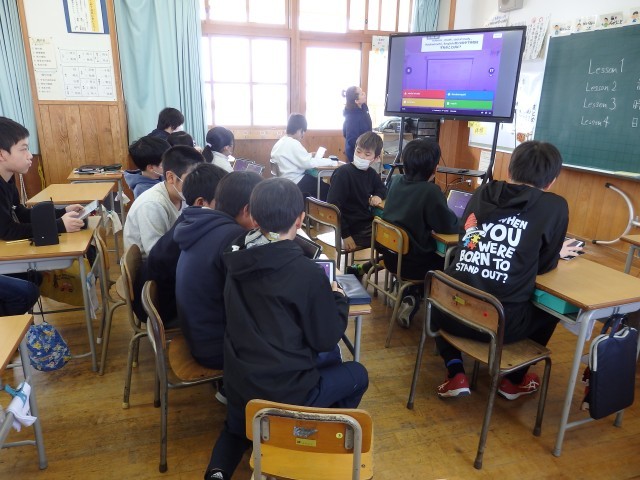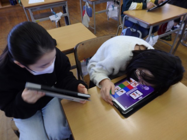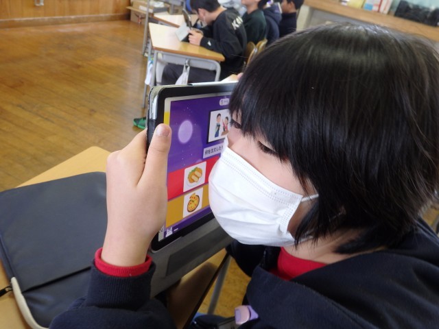 5年生の1時間目は国際科の授業でした。iPadのクイズアプリ「カフート」を使って、1,2学期に学習した内容を復習しました。最初に教科書を見ながら、これまでに学習した内容を振り返りました。そしてクイズ大会です。電子黒板に提示される問題を見て答えたり、1人1人が自分のiPadから流れる英語の音声を聞き取って問題を進めたりしました。