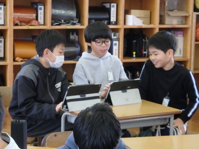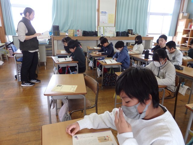 4年生の1時間目は国語の授業でした。「ごんぎつね」の学習です。この物語は、登場人物の1人である加助が語っているという設定で物語が進んでいますが、最後の兵十がごんを撃ってしまったという場面について「兵十はどのように加助に話したのか」を考えました。兵十のセリフを考えたり、兵十と加助のやり取りを考えたりしました。発表の場面では、自分の考えを読み上げる子もいれば劇のようにして分かりやすく工夫した子もいました。