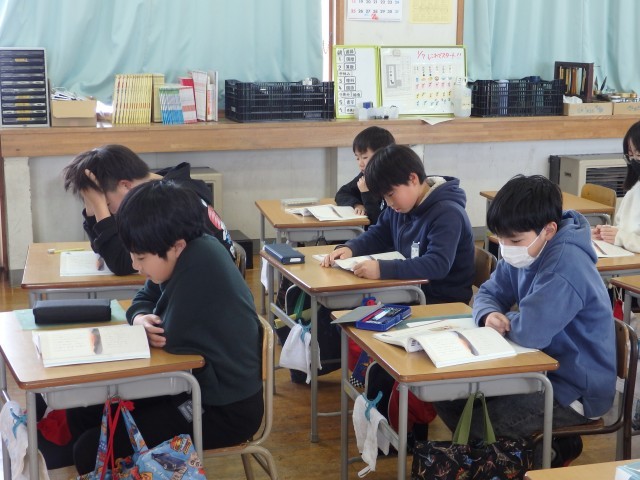 5年生の4時間目は国語の授業でした。「太造じいさんとがん」の学習です。物語を読みながら登場人物、中心人物を確認したり、物語の山場はどこになるのかを考えました。また、読んでいきながら、前の授業で意味調べをした「あんばい」「暁の空」「真一文字」などの難しいことばの意味を確認していきました。