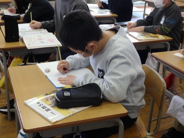 4年生の1時間目は国語の授業でした。「ごんぎつね」の学習です。この物語は、登場人物の1人である加助が語っているという設定で物語が進んでいますが、最後の兵十がごんを撃ってしまったという場面について「兵十はどのように加助に話したのか」を考えました。兵十のセリフを考えたり、兵十と加助のやり取りを考えたりしました。発表の場面では、自分の考えを読み上げる子もいれば劇のようにして分かりやすく工夫した子もいました。