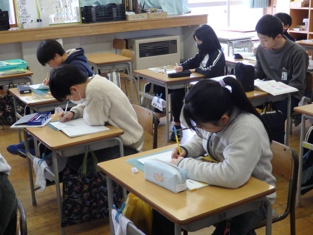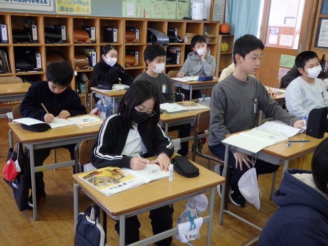 5年生の4時間目は書写の授業でした。地域の方を講師としてお招きし、書き初めの指導をしていただきました。シーンとした中で集中して書く姿が素敵でした。まさに一筆入魂という感じでした。いい字が書けそうですね。