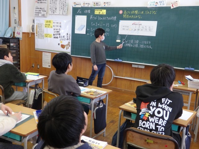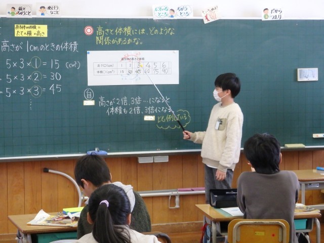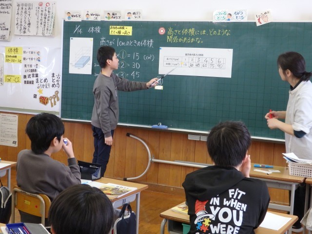 5年生の3時間目は算数の授業でした。「体積」の学習です。まずは「縦4cm、横5cm、高さ1cm」の立方体の図が示され、その体積を求めました。そして、そこから1cmずつ高さが増えていったときの体積を求めました。さらに、高さと体積の関係はどんな関係にあるのかを考えました。