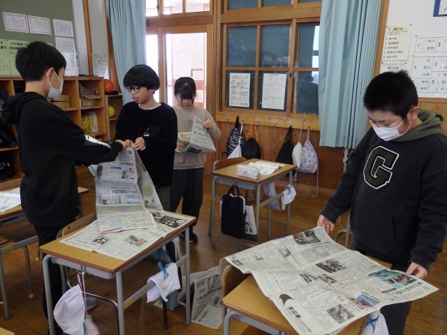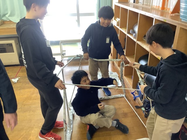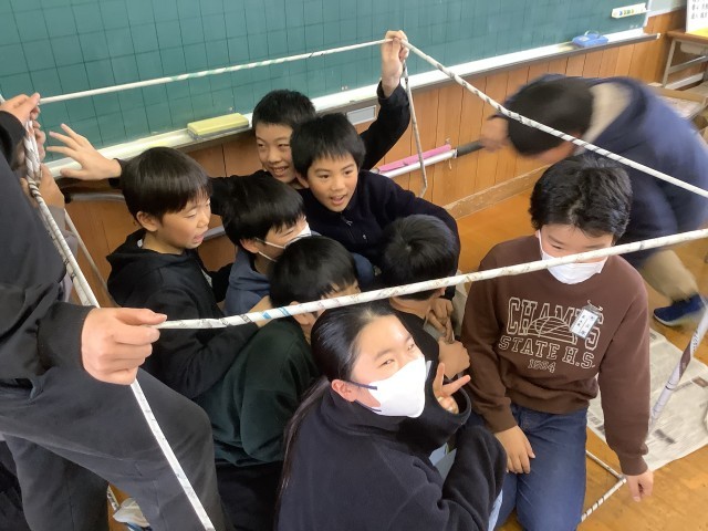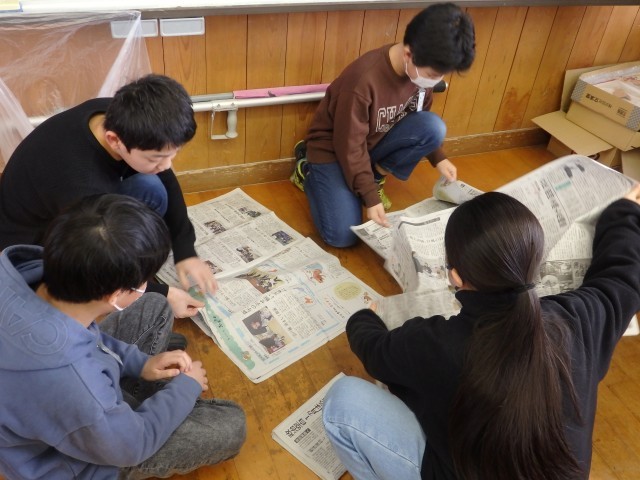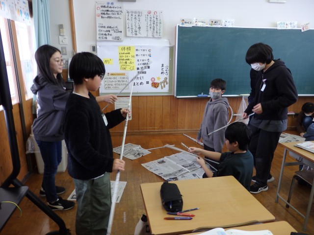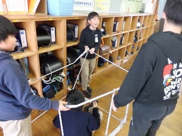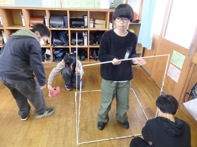 5年生の2時間目は算数の授業でした。「体積」の学習です。1立方メートルの立方体の中に人が何人入れるか実験をしていました。新聞紙をくるくると巻いて1mの棒状にした物を何本も作り、つなぎ合わせて立方体を作ります。どの班も協力して取り組んでいました。きっちり丁寧に新聞紙を巻く班、大雑把に巻く班と様々でしたがなんとか完成して中に入りました。実験の結果、9人の人が入れました。(なぜか三角柱になっている班もありますが・・・)