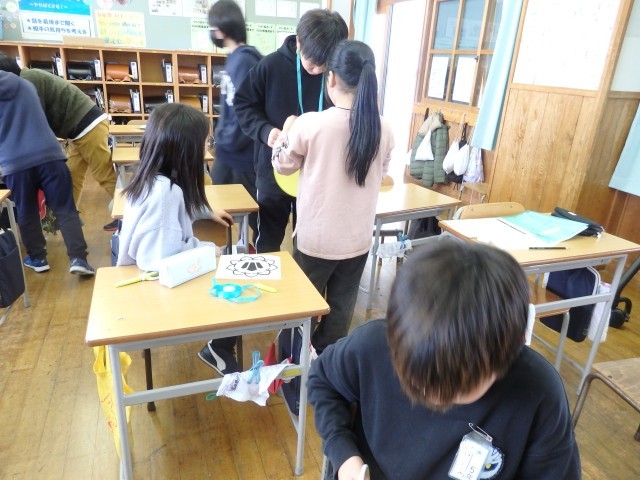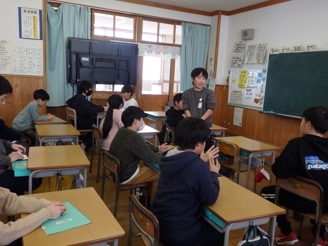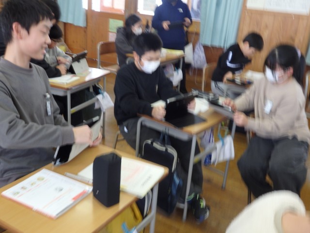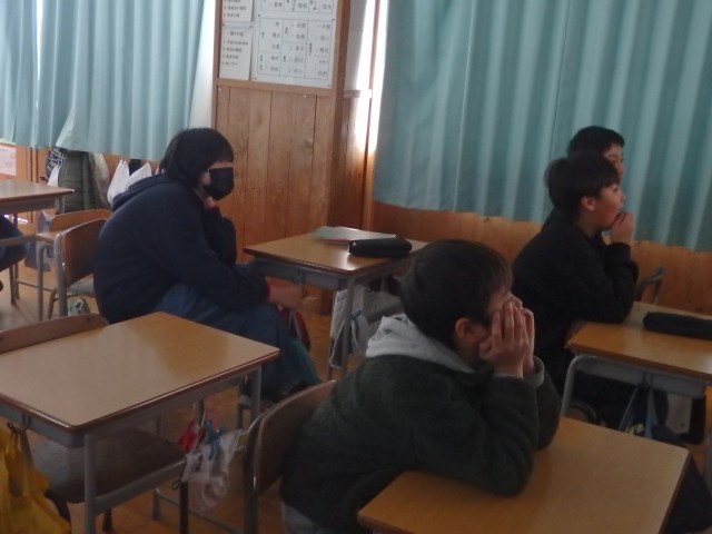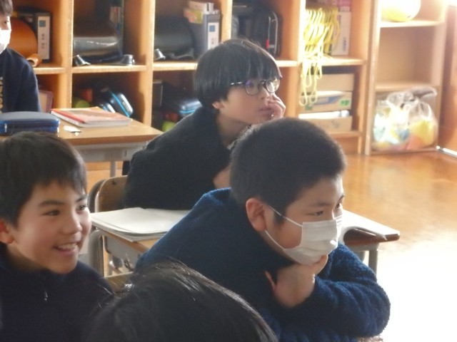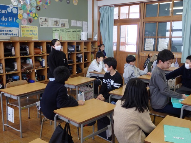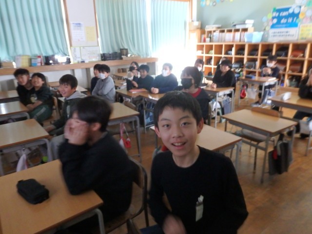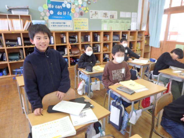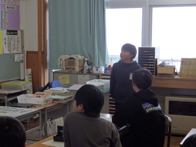 5年生は配り物をして冬休みの生活や1月7日の持ち物などについて確認したり、3学期の係活動を決めたり、4時間目に行うお楽しみ会で何をするか学級委員の子が司会をして話し合ったりしていました。お楽しみ会では「爆弾ゲーム」「何でもバスケット」「全員ババ抜き」をやることに決まりました。
