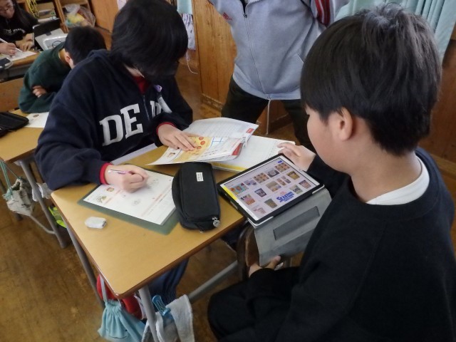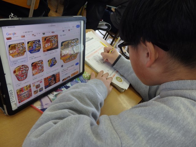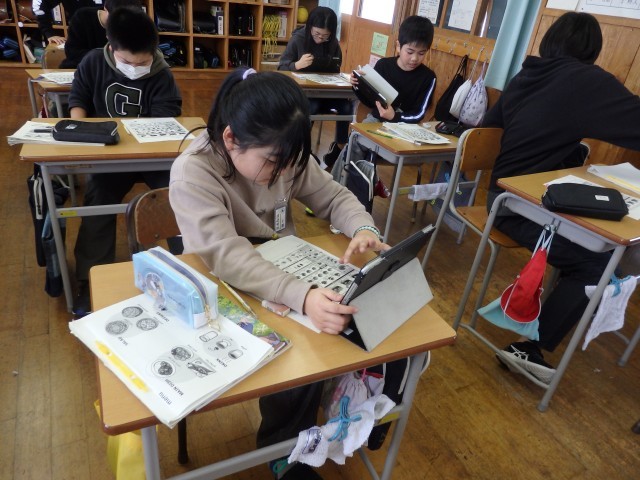 5年生の3時間目は社会の授業でした。「未来とつながる情報」の学習です。子どもたちにとって「情報」ということば自体が馴染みがなかったようで、「情報」の意味を確認刷るところから始まりました。その後、教科書に載っている町や家の中のイラストを見て、「どんな情報が伝えられているか」「誰に向けて何のための情報なのか」気付いたことをノートに書き出していました。ノートにビッシリと気付いたことを書いている子が何人もいました。