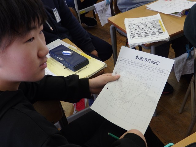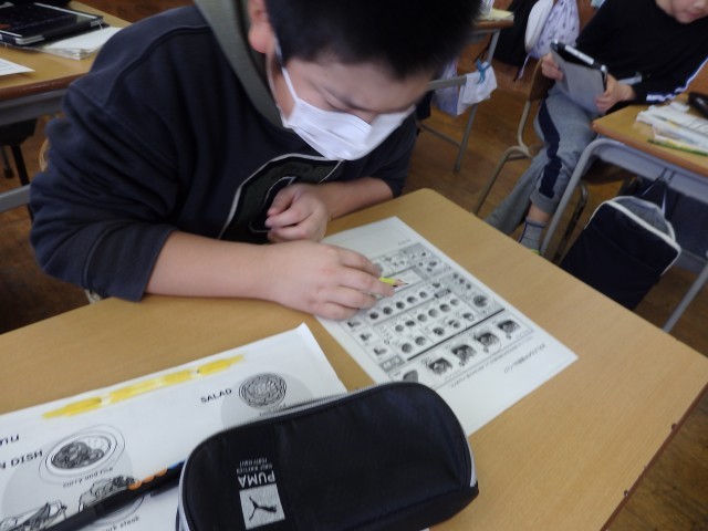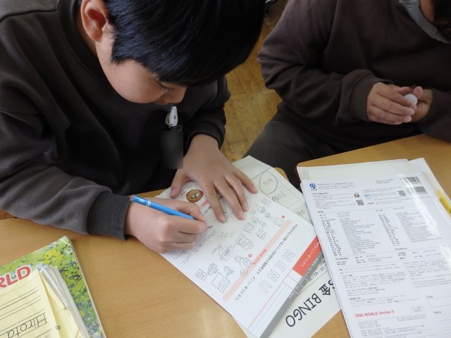 5年生の3時間目は国際科の授業でした。前回の続きでオリジナルのメニューを作りました。まずは10~1,000までの数字を使ってビンゴゲームをしました。100や1000といった切りのいい数字だけでなく540などの数字も英語で言うことができました。「1万は?」「10万は?」といった質問にも答えることができました。その後、メニュー作りをしました。お互いに自分のメニューを見せ合ったり、料理名のローマ字を教え合ったりしていました。