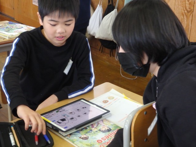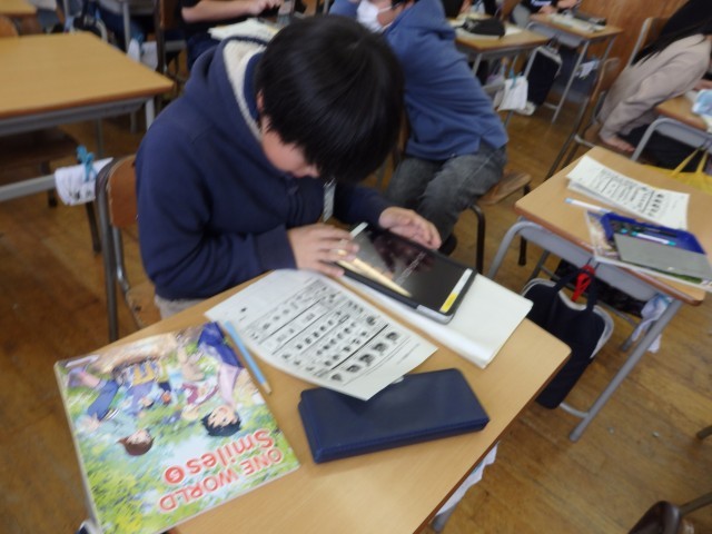 5年生の1時間目は国際科の授業でした。iPadのクイズアプリ「カフート」を使って、1,2学期に学習した内容を復習しました。最初に教科書を見ながら、これまでに学習した内容を振り返りました。そしてクイズ大会です。電子黒板に提示される問題を見て答えたり、1人1人が自分のiPadから流れる英語の音声を聞き取って問題を進めたりしました。