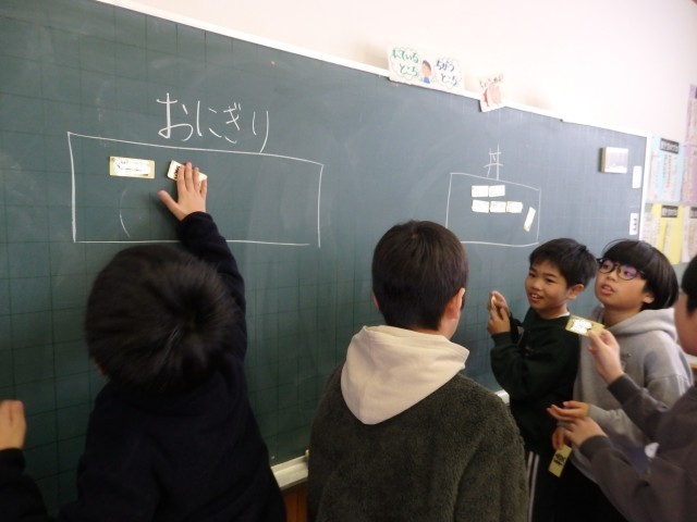 5年生の2時間目は総合の授業でした。「お米『激・う米』の活用」について話し合いをしていました。テーマは『激・う米』を使って一品作るなら丼にするかかおにぎりにするかです。班で話し合った後、ネームプレートで丼がいいかおにぎりがいいかを意思表示します。人数はほぼ互角。丼派、おにぎり派それぞれが「こっちの方がこういう点でいい!」とアピール合戦です。おにぎり派からは「具材を入れて楽しめる」「いろいろな形で作れる」「洗い物が少なくすむ」「量の調節ができる」、丼派からは「具材を乗せるだけでいい」「手が汚れない」「具だくさんにできる」「ゴミが少ない」などのアピールポイントが出され、白熱したピール合戦になりました。アピール合戦の結果、おにぎりに決定したそうです。