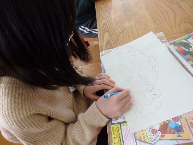 5年生の4時間目は図工の授業でした。木工で10ピース以上のパズルの制作です。紙に下書きをしたら、木の板に書き写し、電動のこぎりで切ってパズルのピースを作ります。電動のこぎりを使うのは初めてですので、まずは先生から使い方と注意点について話がありました。魚、カブトムシ、SL、キャラクターなどの自分の好きなものを描いている子もいれば、自分の名前や幾何学模様を描いている子もいました。