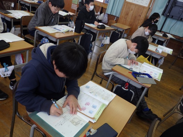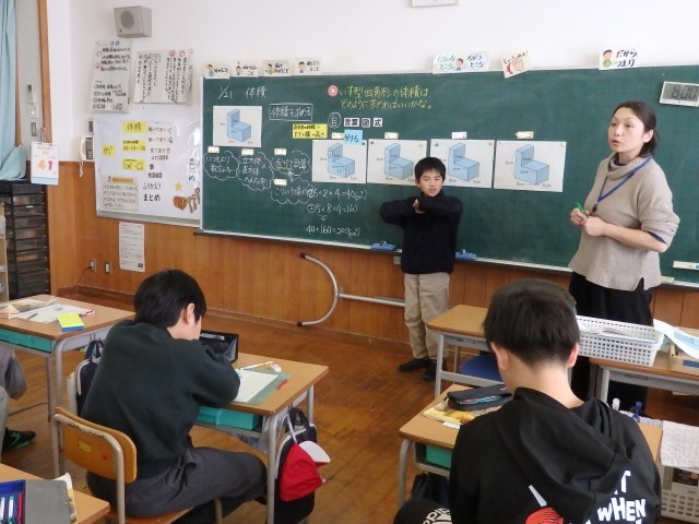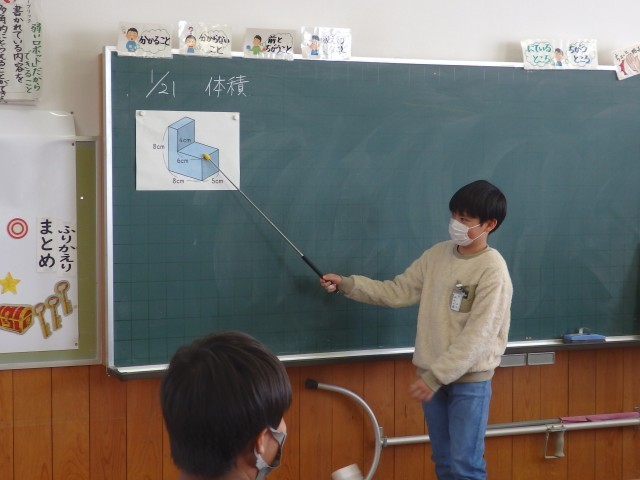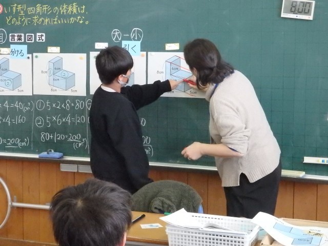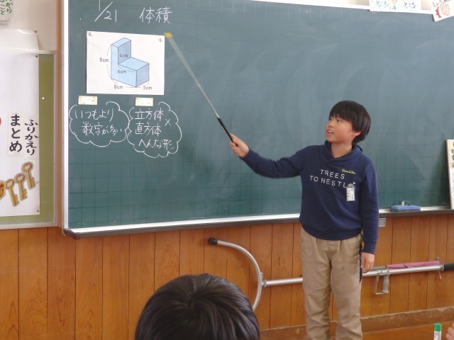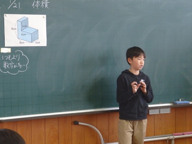 5年生の4時間目は算数の授業でした。他校の先生や市の指導主事が参観しての授業でした。「体積」の学習です。イスの形をした図形の体積はどうやって求めたらいいか考えました。先生がイスの形の図を示すと「やっときた!」とやる気満々の声を出した子がいました。イス型を2つに分けたり、1つの直方体になるように足りない部分を補ったり、2つのイスを重ねたりして体積を求めました。また、発表する子だけでなく、「縦、横、高さ」やその計算をまだ発言していない他の子に答えてもらうなど多くの子どもたちが発言する授業でした。