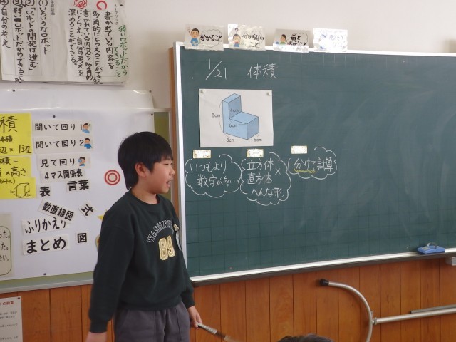 5年生の2時間目は算数の授業でした。「体積」の学習です。黒板に縦2m、横3m、高さ2mのある立体の図が掲示され、まずは気付いたことを発表していきました。「単位がcmからmになった」「直方体だ」「体積の求め方は縦×横×高さ」などの気付きが発表されました。そして実際に体積がいくつになるか確かめました。「教室の体積は?」という疑問が子どもたちから出されたので、先生が歩幅でだいたいの長さを割り出し、計算してみました。約216立方メートルなのだそうです。