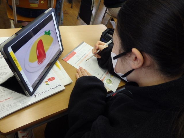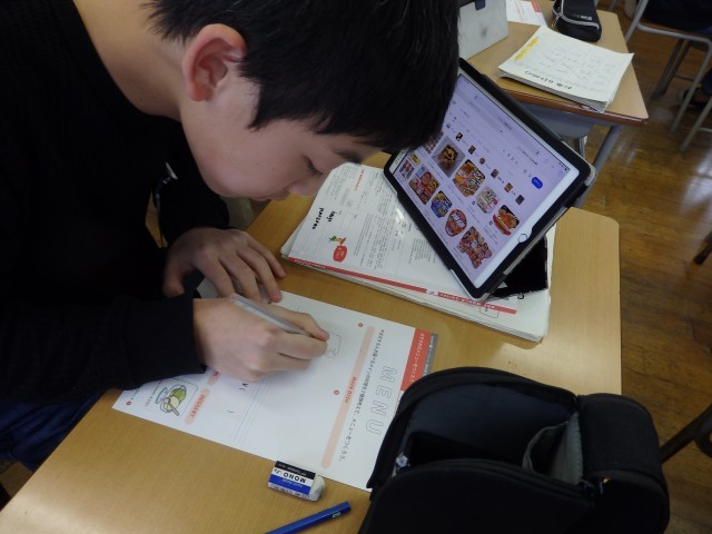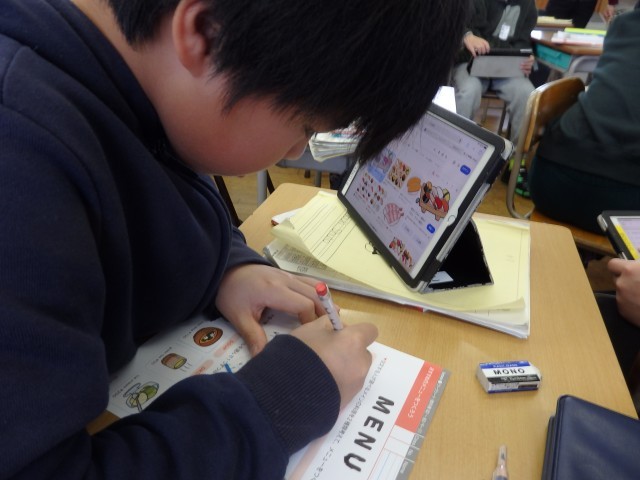 5年生の1時間目は国際科の授業でした。まずは値段を表現するときに必要な100や1000などの数字の言い方をビンゴゲームで復習しました。その後、オリジナルのメニューを作りました。子どもたち1人1人がレストランのオーナーです。メニューを2つ考えて絵を描き、名前を付け、値段も設定します。iPadで好きな食べ物の画像を調べて、かなり真剣に描いている様子が写真から分かりますでしょうか。