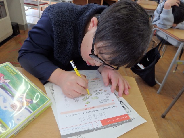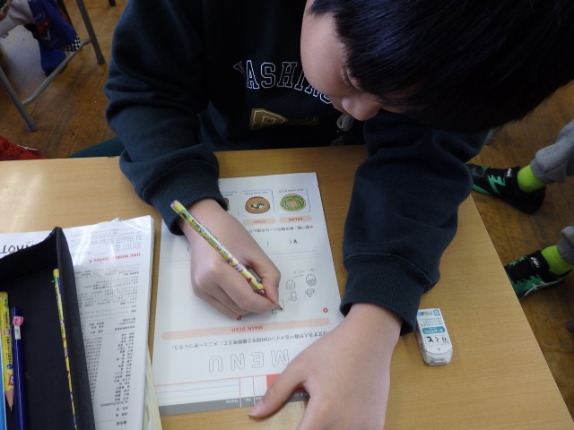 5年生の1時間目は国際科の授業でした。「レストランなどで注文する」ときの表現の学習です。まずは「I'd like ○○ and △△.」という英語を使って「STAR WARS」というゲームをしました。その後、レストランに来た設定でメインディッシュ、サラダ、飲み物、デザートから注文したいものをを1品ずつ選び、店員役とお客役になって注文するやり取りをしました。