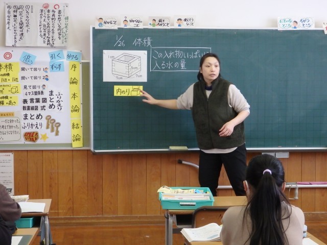 5年生の2時間目は算数の授業でした。体積の学習です。「縦7cm、横7cm、高さ5cm、板の厚さが1cmの容器に入る水の量」を求める問題に取り組んでいました。これまでのように、ただ「縦×横×高さ」で計算するのではなく、板の厚さ分を引き算しなければいけません。「内のり」「容量」という用語も学びました。正直言って「内のり」ということば、私は初めて知りました。