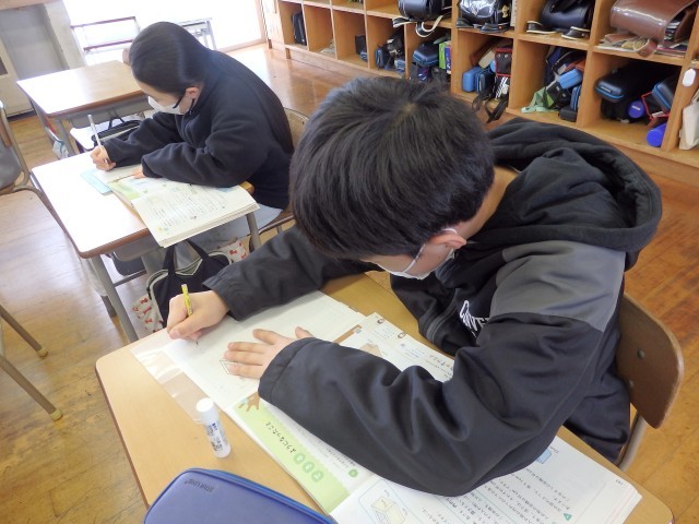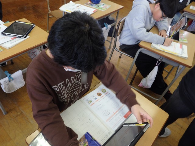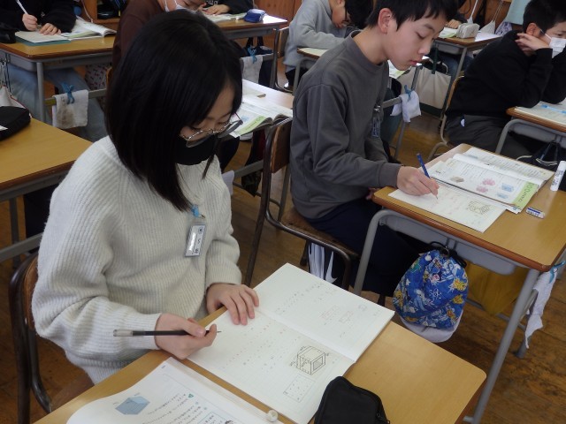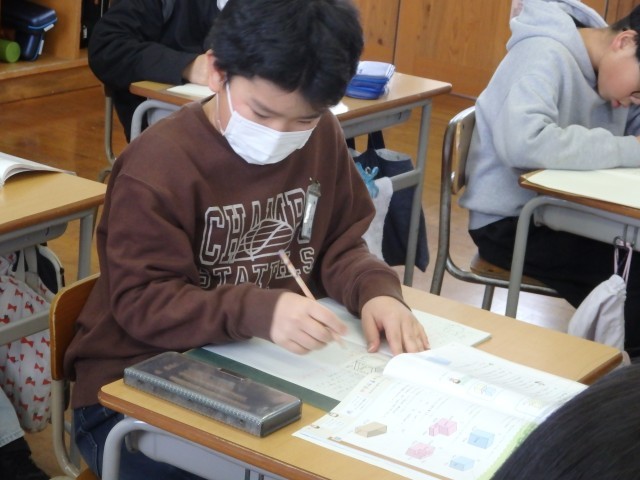 5年生の3時間目は算数の授業でした。「体積」についての学習です。たくさんの問題に取り組む時間です。2つの教室に分かれて行っていました。先生や友だちに教えてもらいながら、集中して取り組んでいました。