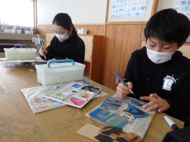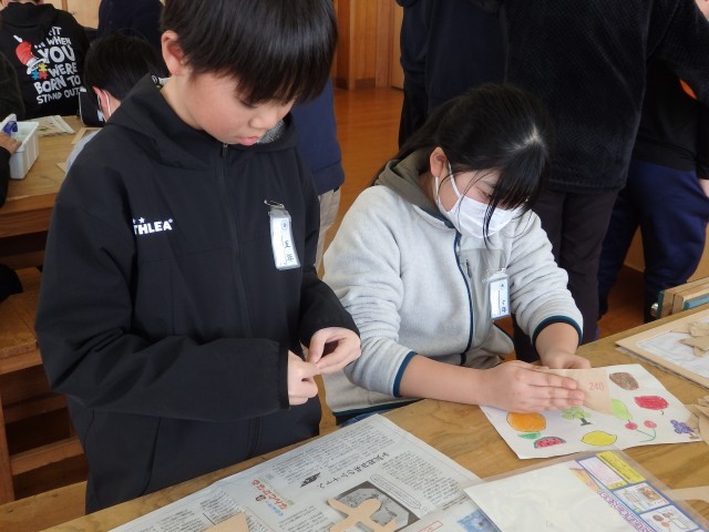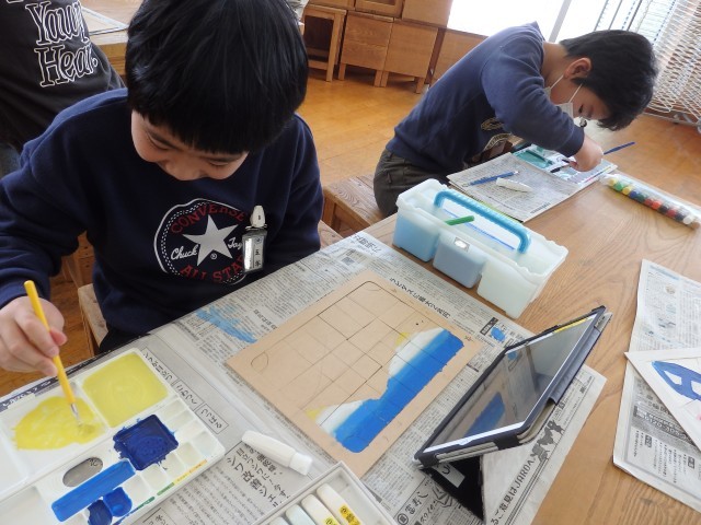 5年生の4時間目は図工の授業でした。「切り分けた形から何つくる?」の学習でパズルを作っています。木材を切り分けたり、色を塗ったり、ニスを塗ったりと各自の進度に応じて取り組んでいました。山の絵をグラデーションを付けてきれいに塗っている子がいました。「すごい!」の一言です。また、すべて同じ大きさの正方形に切り分けた子が、色を塗るために組み立てますが、とっても苦労していました。