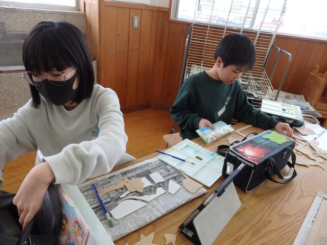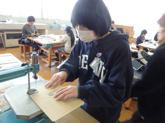 5年生の6時間目は図工の授業でした。「切り分けた形から何作る?」の学習です。絵を描いた木材を切ってパズルを作っています。何10ピースにもなるほど細かく切り分けている子がいました。「雅」という画数が多い難しい漢字を見事に切り抜いた子もいました。知育玩具のように、合う形を当てはめていくパズルにした子もいます。電動のこぎりで板を切る友だちを、順番待ちしながら心配そうに見つめている姿がとてもいい雰囲気でした。