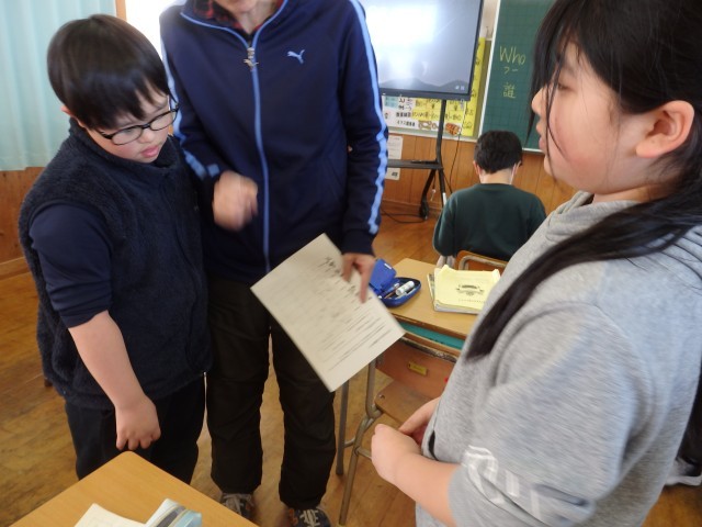 5年生の6時間目は国際科の授業でした。前の授業で学習した8つの「人の特徴や性格を表すことば」がそれぞれ誰に当てはまるのかを考え、「Who is brave?(勇気ある人は誰?)」「Anpanman is brave.(アンパンマンだね)」のように尋ね合いました。全てアニメキャラで考えた子、ポケモンで考えた子、魚の種類で考えた子、自分が飼っているペットをcuteに入れている子がいました。