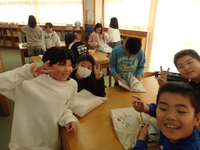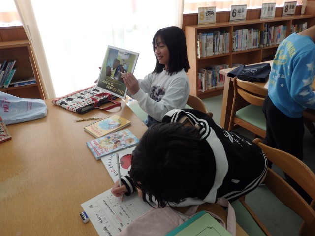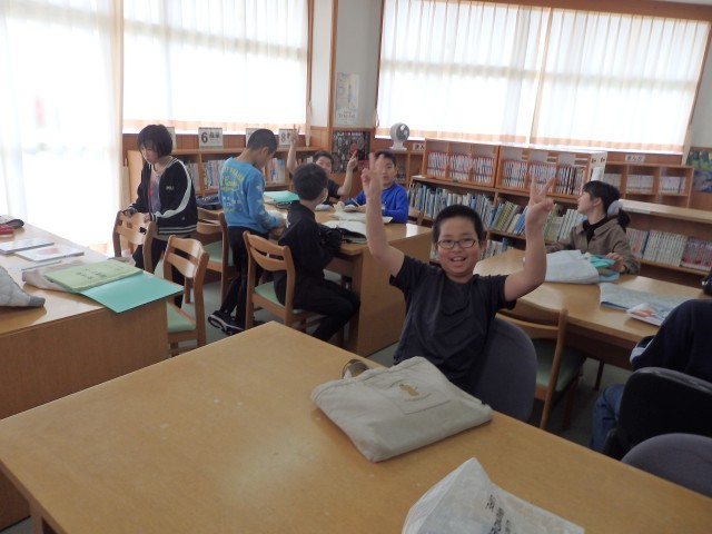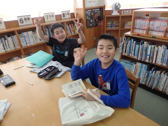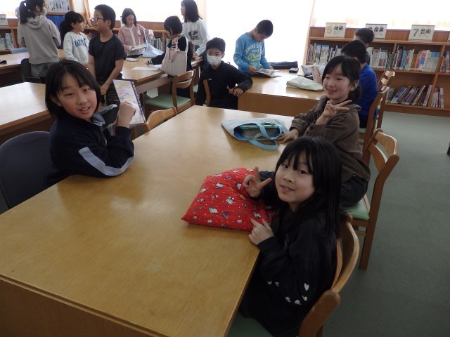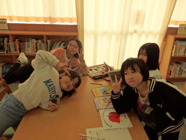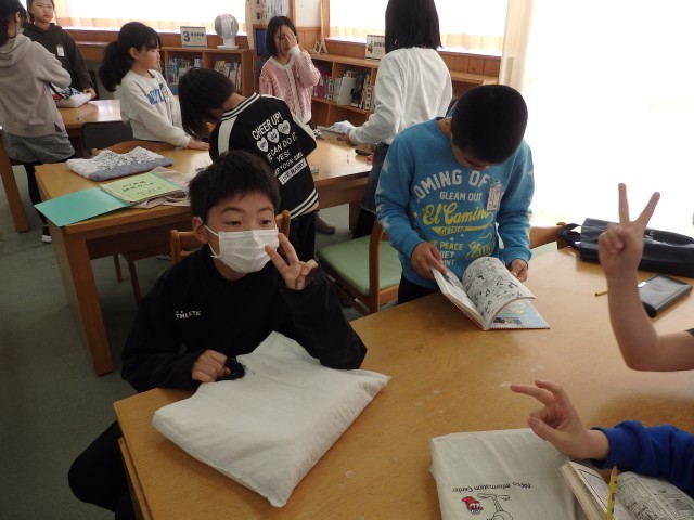 5年生の4時間目は図書室で読書です。自分で読みたい本を選んで借りました。授業が終わるというところでしたので、写真のようなリラックスムードでした。たくさん本を読んで活字に親しんでほしいです。
