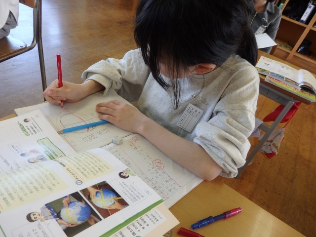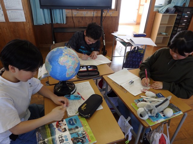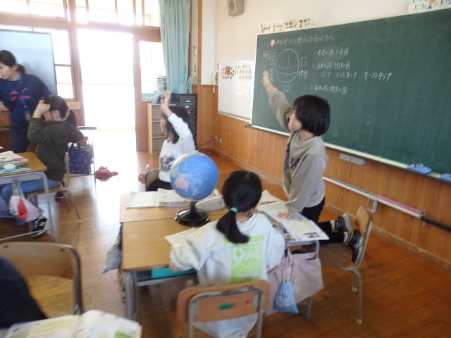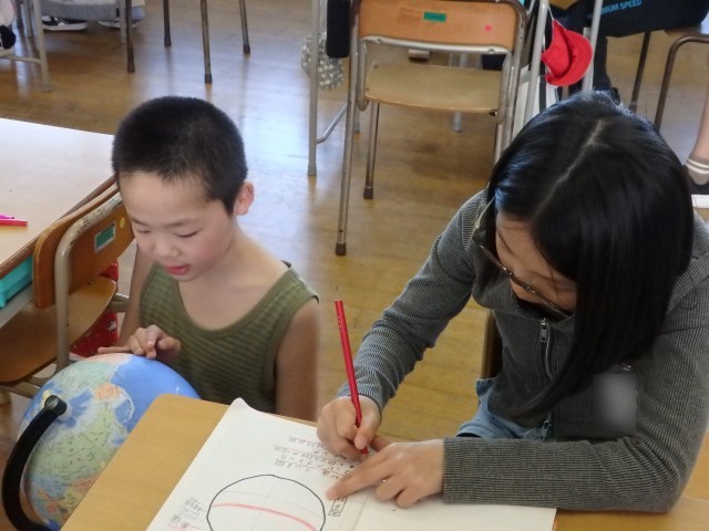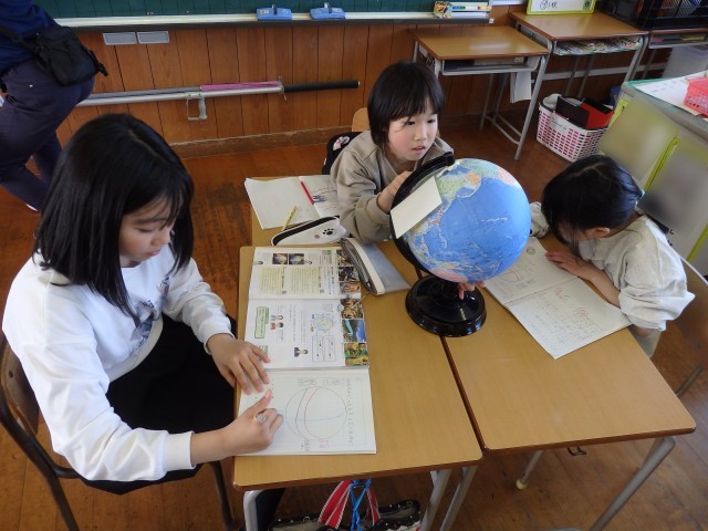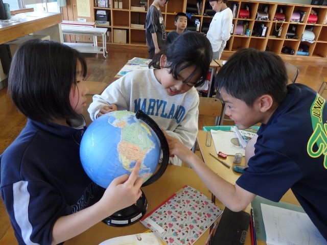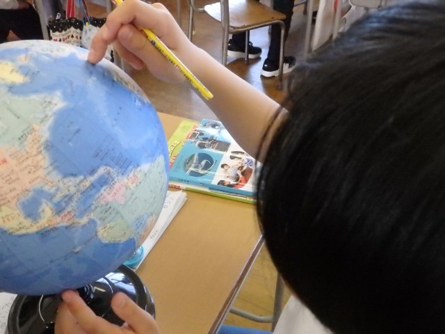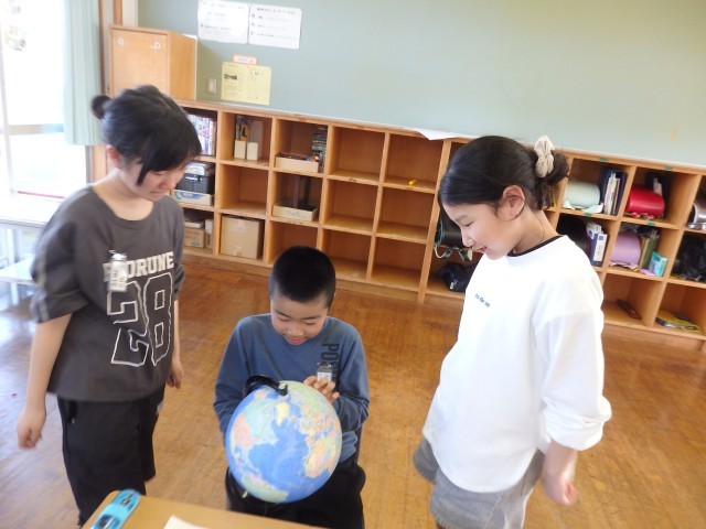 5年生の5時間目は社会の授業でした。「緯度と経度」の学習です。班ごとで地球儀を使って「赤道を通っている国」、「日本と同じ経度の国」、「日本と同じ緯度の国」を探しました。じーっと目をこらして地球儀を見つめる表情がいいですね。班で協力して取り組んでいました。